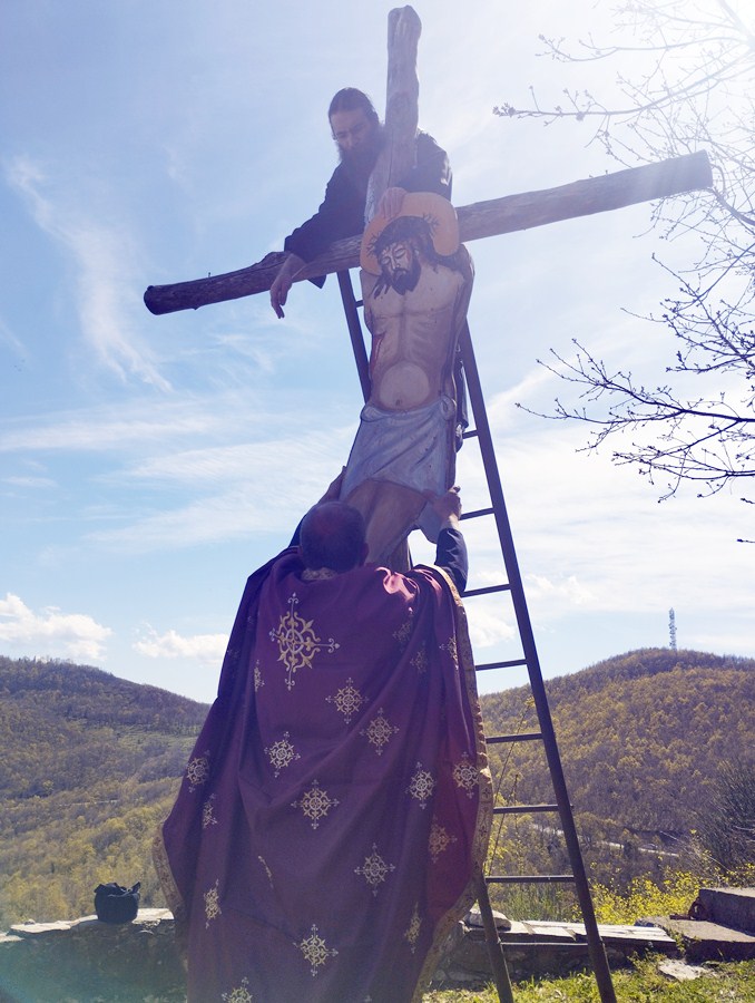 Πρόκειται για την αναπαράσταση της Αποκαθηλώσεως η οποία τελείται κάθε χρόνο νωρίς το απόγευμα της Μεγάλης Παρασκευής σε αντίθεση με τους ενοριακούς ναούς όπου λαμβάνει χώρα το πρωί.